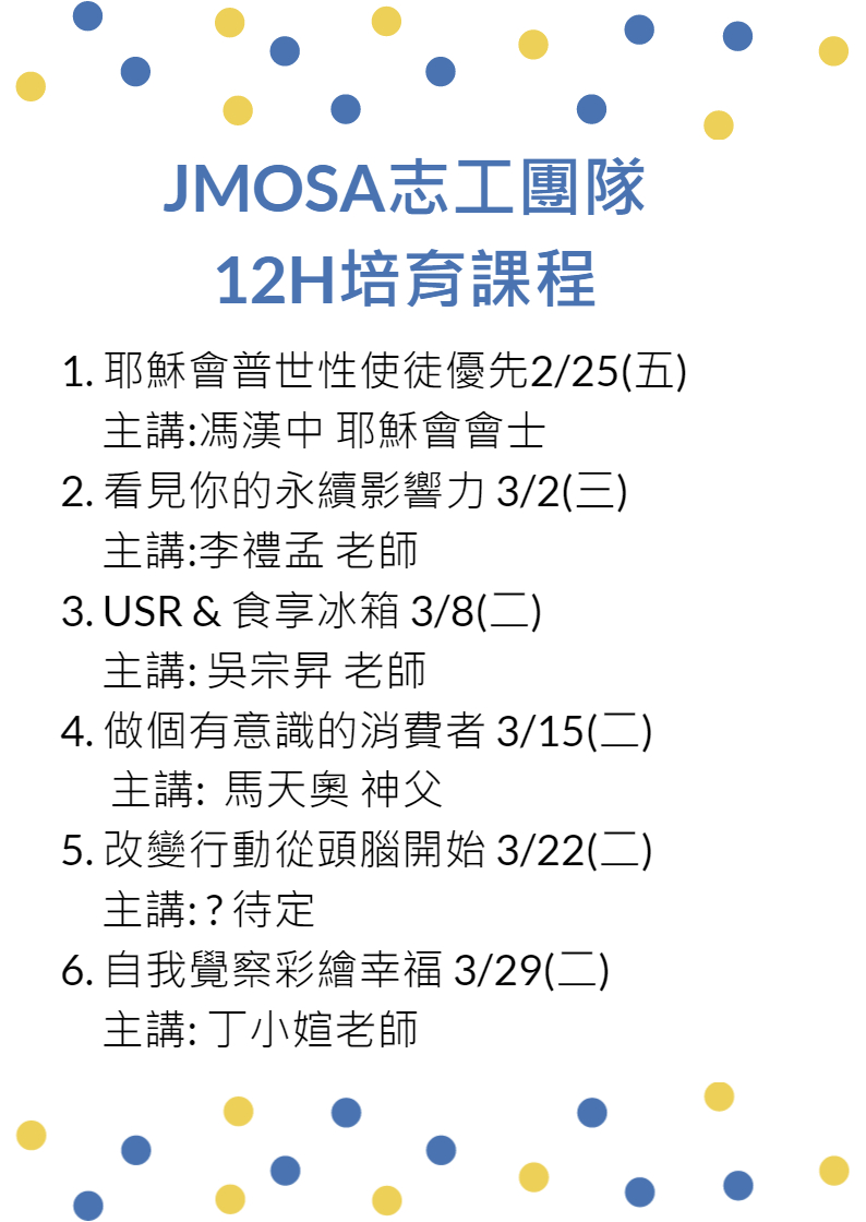 JMOSA志工培育課程共有六個單元, 主題分別為: 1. 耶穌會的四項普世性使徒優先 (馮漢中 耶穌會會士) 2. 看見你的永續影響力 (李禮孟 老師) 3. USR & 食享冰箱 (吳宗昇 老師) 4. 做個有意識的消費者 (馬天奧 神父) 5. 改變行動從頭腦開始 (屠崇軒 講師) 6. 自我覺察彩繪幸福 (丁小媗 老師) 流程: 17:10~18:00 用餐時間 18:00~20:00 課程時間